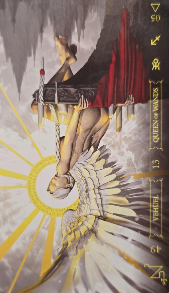 守護天使哈哈伊亞(HAHAIAH),傳遞的訊息是"神是避難所"。過度一成不變的態度會導致(對未來事物的想像和希望)停滯、為自己的不正當行為辯護,以及謊言、惡意、背叛和誹謗。逆位的聖杯王后,彰顯事物的惡毒、不光彩、不誠實、墮落、粗魯的一面,像是腐敗與醜聞,或者染上惡習。