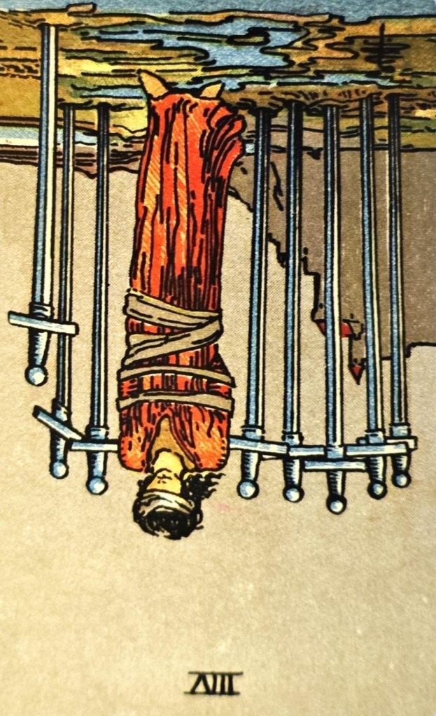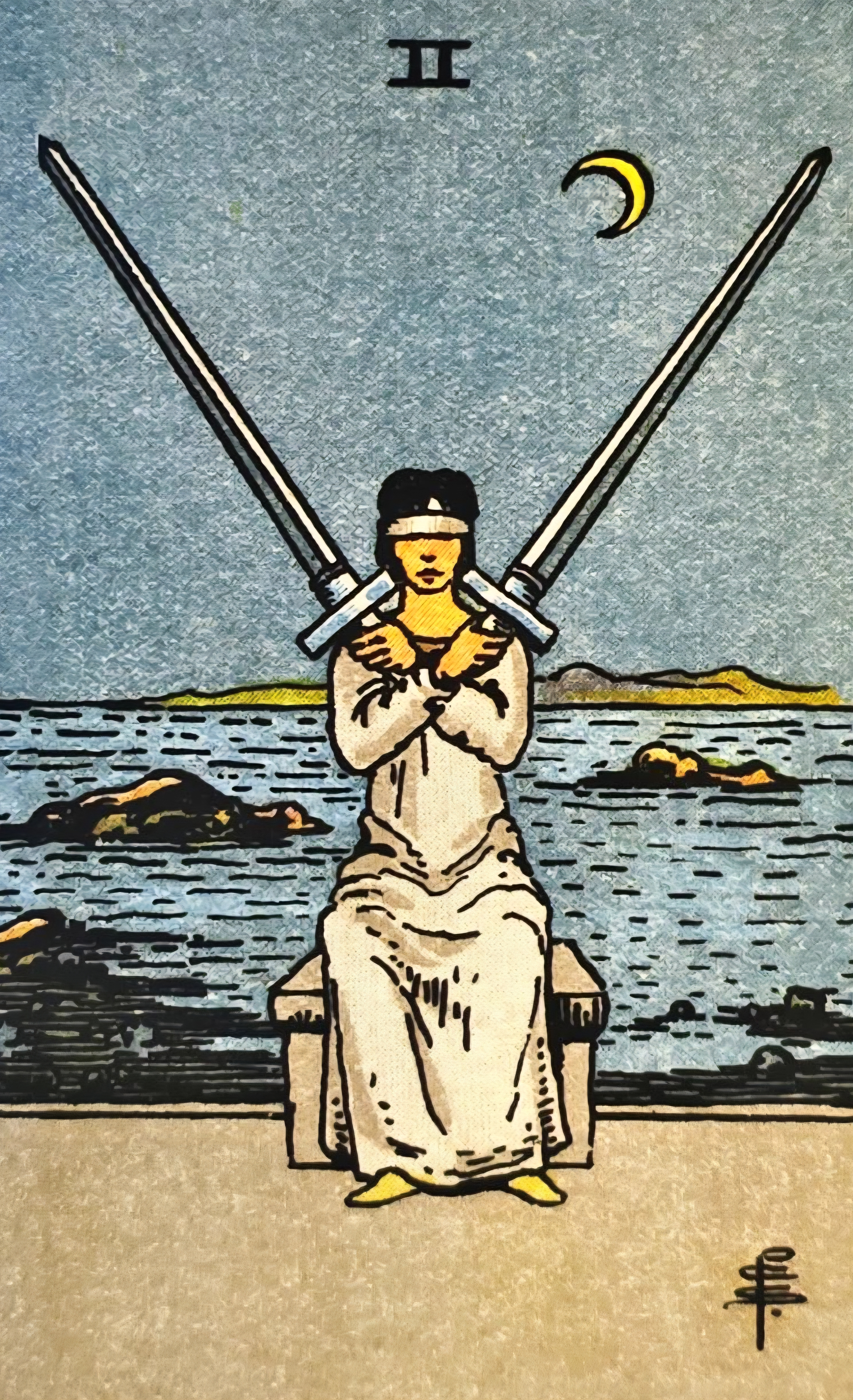 逆位的寶劍二代表受到兩種不同外力的影響,因而使修訂《皇室典範》這件事陷入兩面不討好的尷尬狀態;暗示負責修訂《皇室典範》的大臣完全無法解決這個問題,所以最多只能維持表面上的和諧,至於實質內在的東西已不是他所能負責的了。