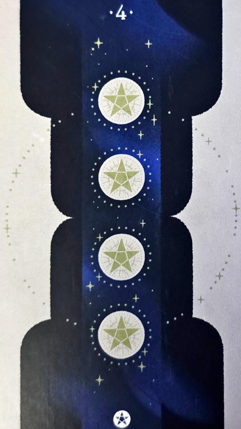星幣四,四枚硬幣排列成一根堅固的柱子,象徵著物質世界的安全感,顯示國家在一種穩固而有利的狀態。除此,這張牌也代表保護、安心,它顯示這位【女性天皇】是國家內部的力量中心,能給國民帶來穩定感、安全感,還有內在力量。