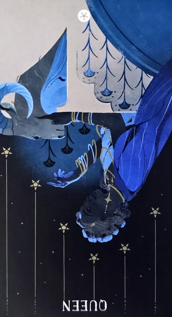 逆位的星幣王后代表占有欲愈來愈強,對安全感和地位的渴望日漸加劇,如果有人威脅要把這一切奪走,就會想辦法施以報復,或決定不惜一切代價把它奪回來的那一些人,或那一派。