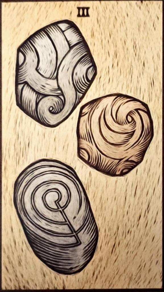 雖然世人希望自己的心就像鎖蛇的皮一樣難以穿透,但體驗自己的感受是至關重要的。寶劍三描述的是情感上的風暴,它會掀起痛苦、失落、悲傷和失望。而這張牌卡的課題就是「接受自己的悲傷,並且安然度過」。總的來說,人無法將痛苦推開,而必須以某種方式將它帶入內心深處,直到痛苦被勇氣與愛所轉化。