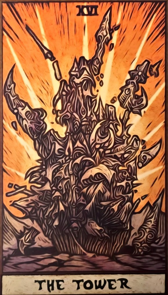 「塔」牌代表瞬間改變現況的天雷,所帶來的崩壞。這應該很容易讓人聯想到拉比猶太教典《米大示》(Midrash)當中的故事:神為了懲罰人的罪,放火燒了巴別塔(tower of Babel)。暗示「追求精神世界」這條路徑,瀕臨極限。