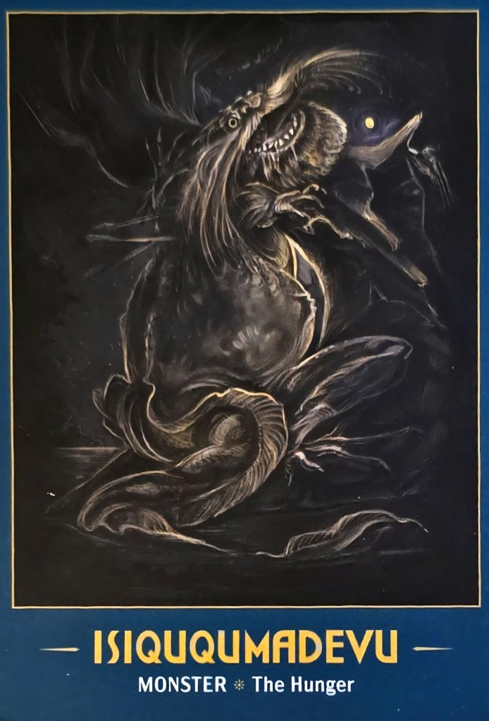 | 伊西庫庫馬德武是祖魯神話中一個吞噬一切的怪物,它會吞噬任何東西,無論是人、動物、物體,整個吞下。它表示在這件事的歷程中,這些人們會感到不滿足,彷彿渴望更多或不同的事物,這並非因為他們不夠努力,而是他們的努力似乎未達到預期效果。這是很容易因為慾望而失去理智的時候。這也意謂著此時應該透過堅守真理的脈絡,對「正義」這個目標保持忠誠,如此便能在即為紊亂而壓迫人的情境中,獲致勝利與解放。 |